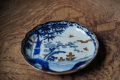 春の情景が、落ち着いた染付の藍と金彩で品よく描かれています。