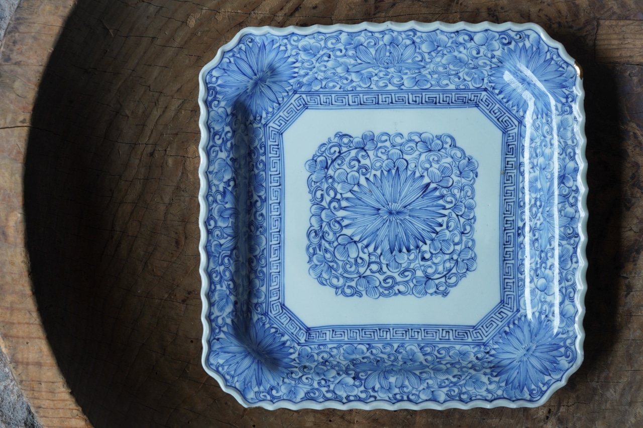 線描菊唐草角皿