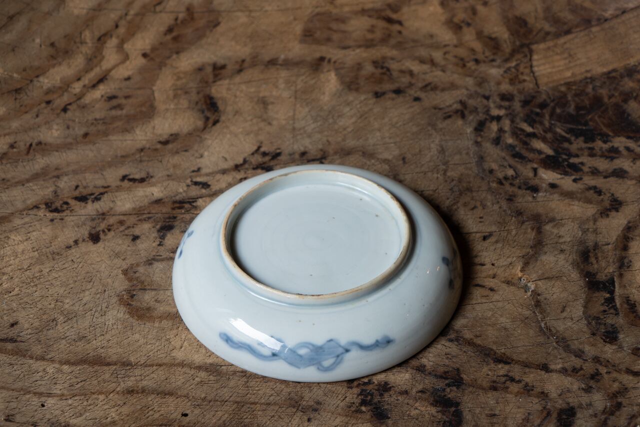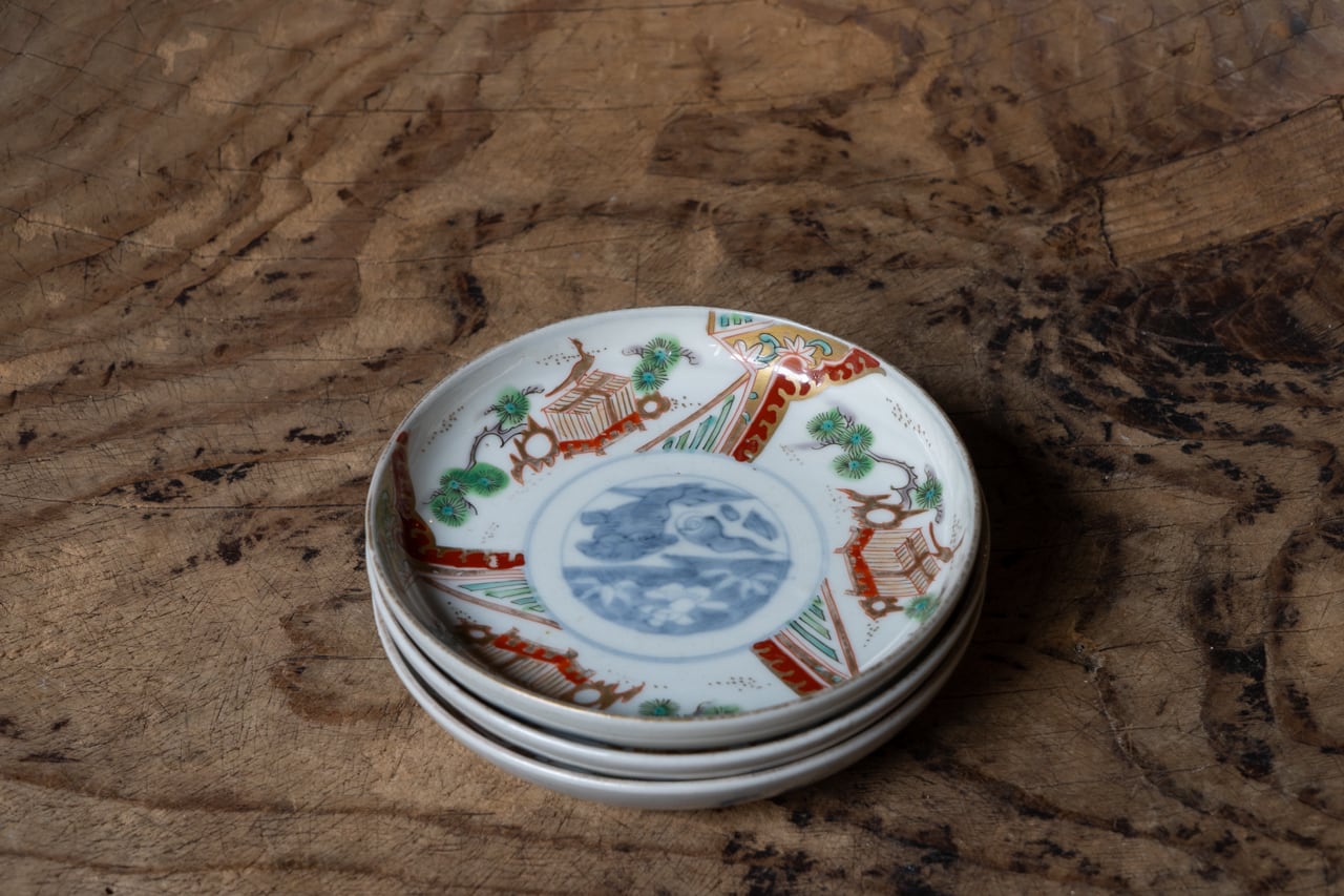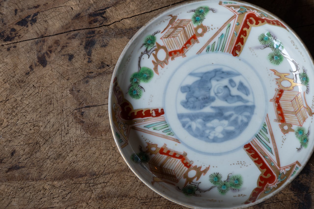淡い緑の松と、金彩の鳥籠が描かれた小皿。