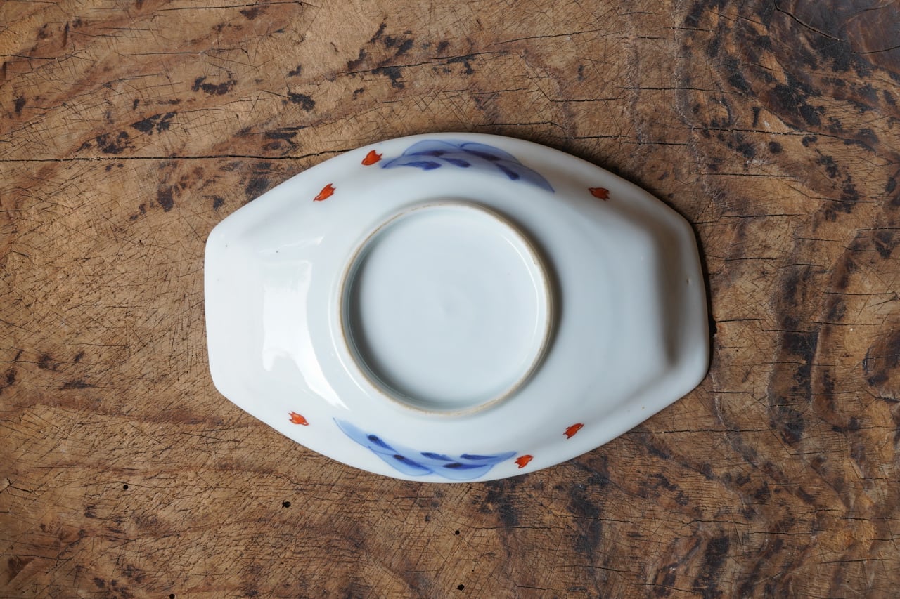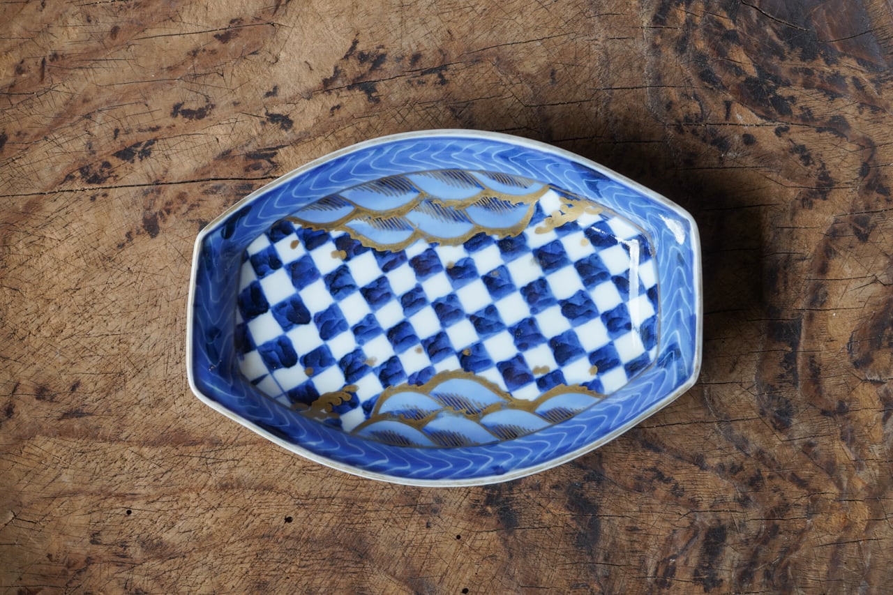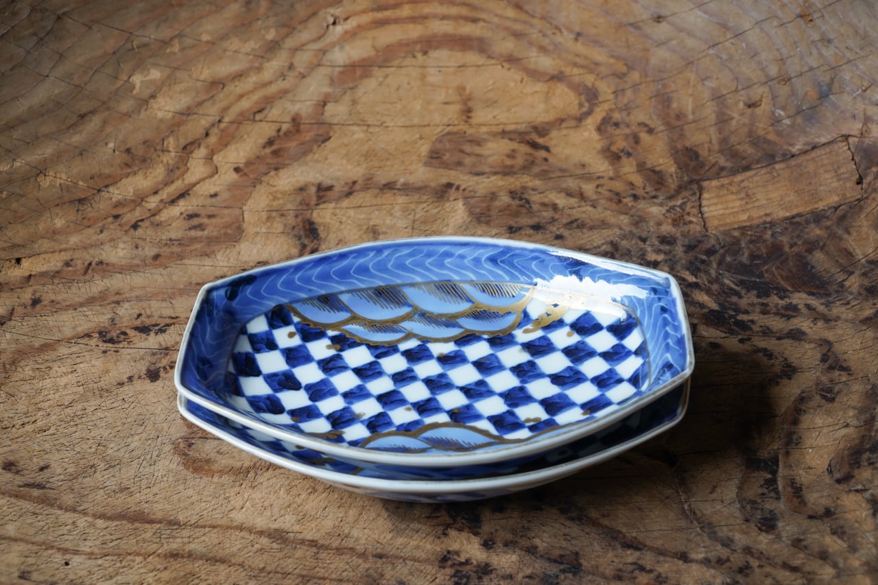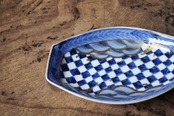 市松模様と金彩に縁取られた波から華やかさを感じる舟形皿。