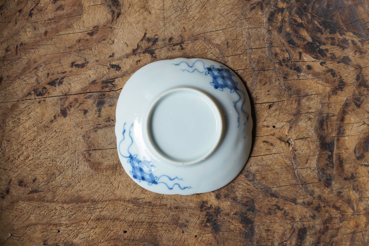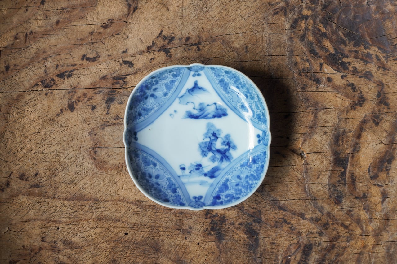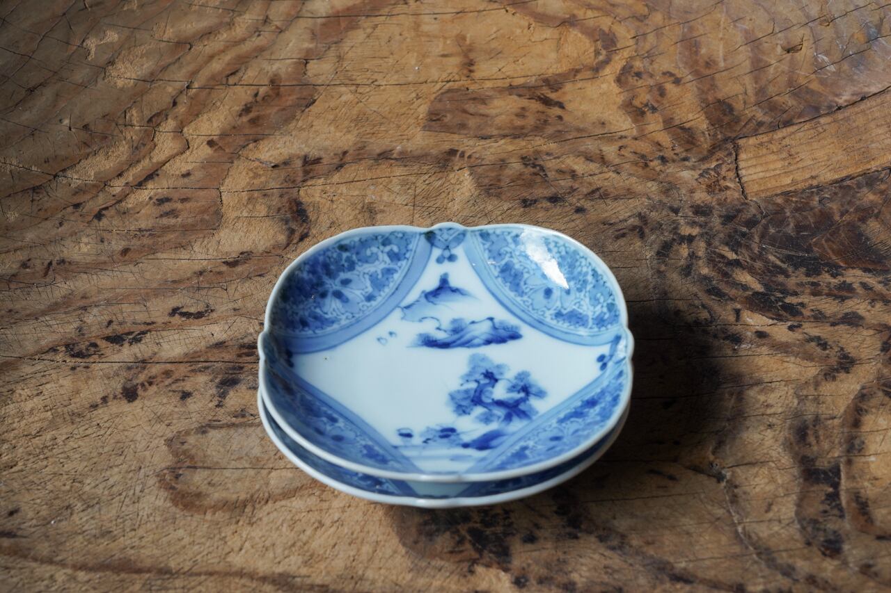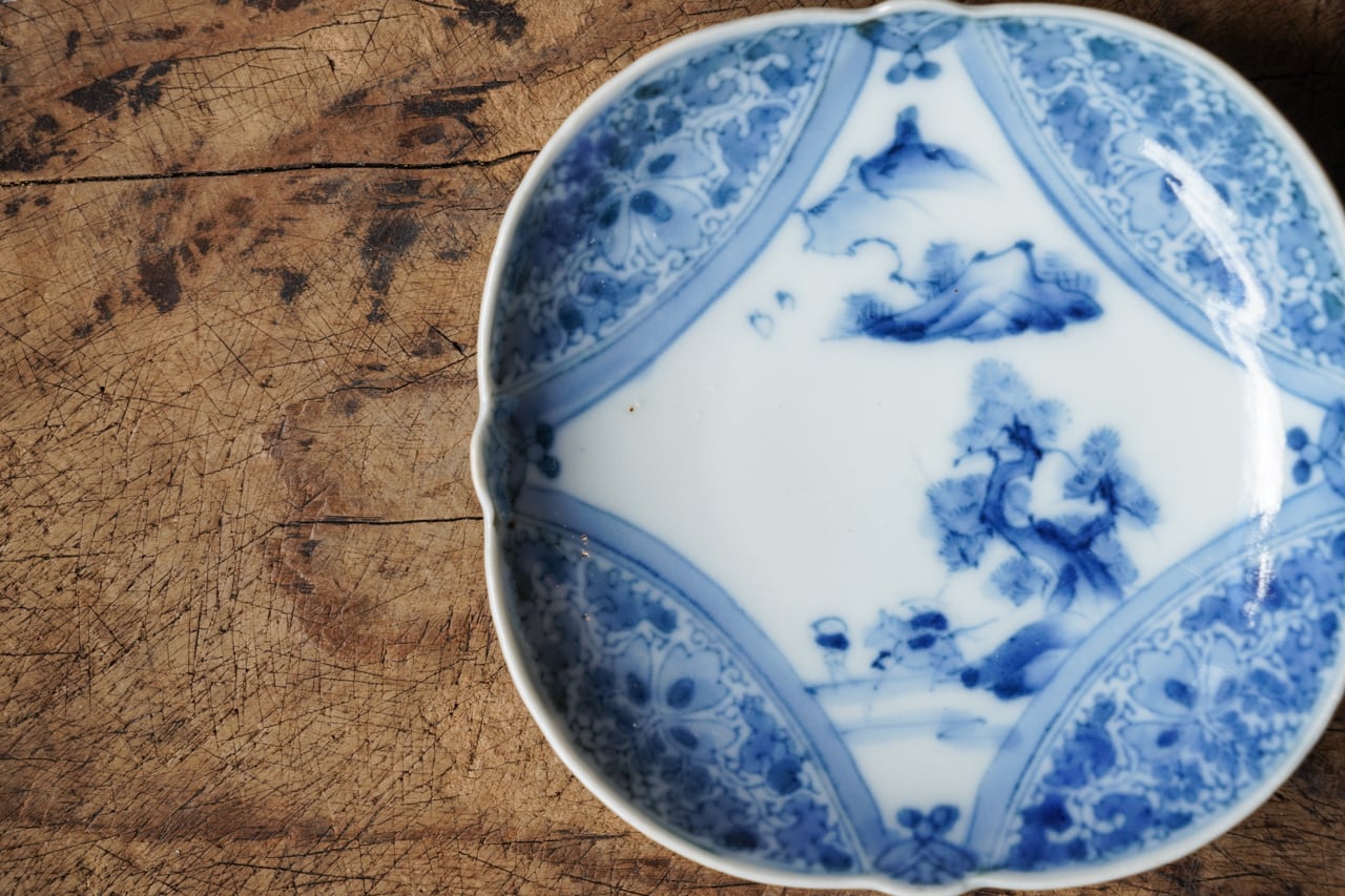 四隅に施された花唐草の文様が幕のように広がり、中央の風景図を引き立たせています。