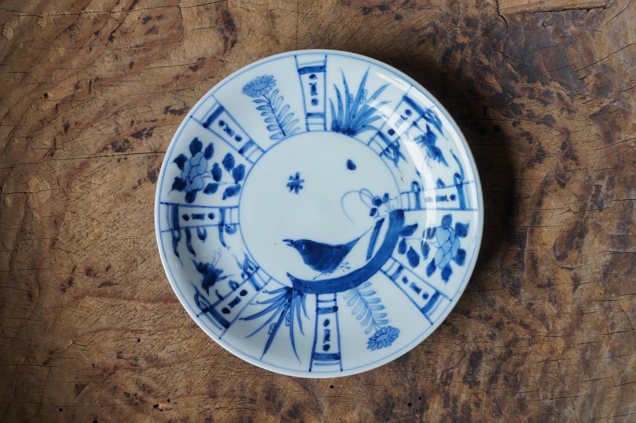 中央には羽を休める鳥、周囲には生き生きとした草花が描かれ、