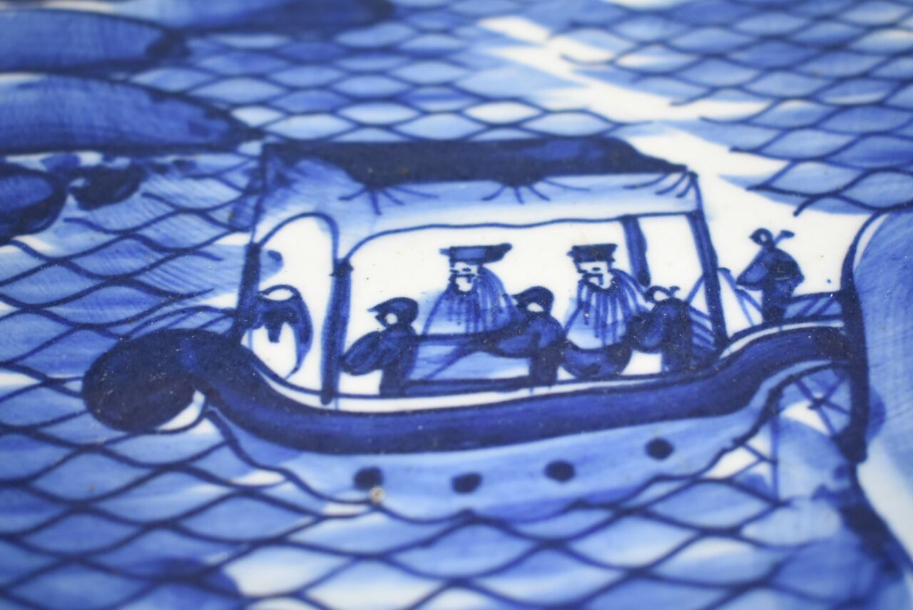 見込み上部に漢文を描き、その下に風景、船を落とし込んだ壮大な大皿です。なんと直径40センチ。圧巻です。