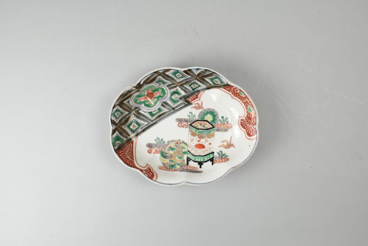 脚付に籠?でしょうか、、なんか団子みたいなのがモリモリに入っています。よくみると青海波に波千鳥が描かれているではありませんか。龍もカッコいいですが、正面を向いてる兎がよいです。なんか見れば見るほどトリッキーな絵付けですね。