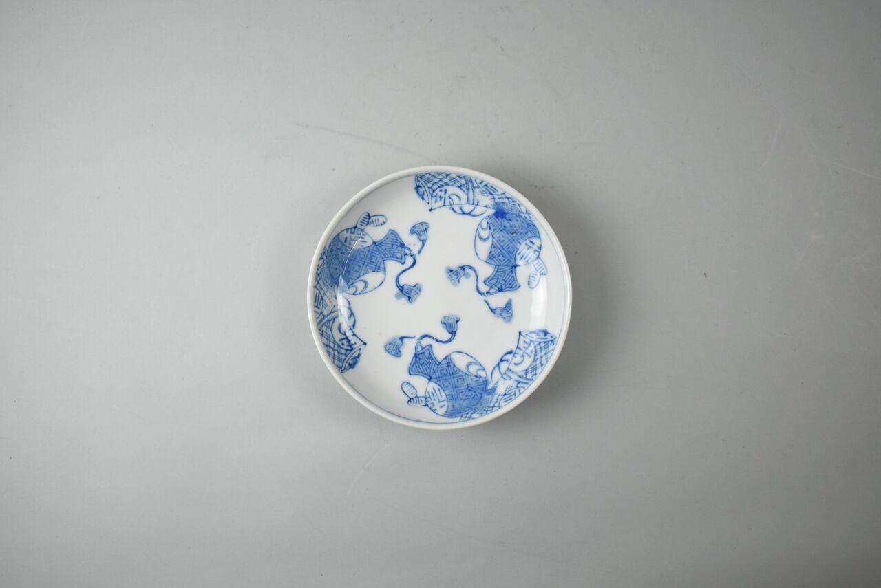 福の紋が入った小槌、寿紋の巻物が三つ巴の配置で描かれたおめでたバブリーな小皿。