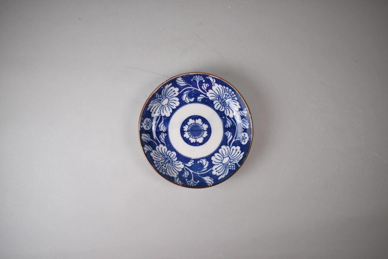 印判のお皿はもっと細かい模様が多いのですが、このお皿のデザインは割とシンプルで分かりやすい印象を覚えます。当店にはこれ以外にもいろんな印判のお皿はあるのですが、画題がシンプルのため埋もれず目立っている印象です。