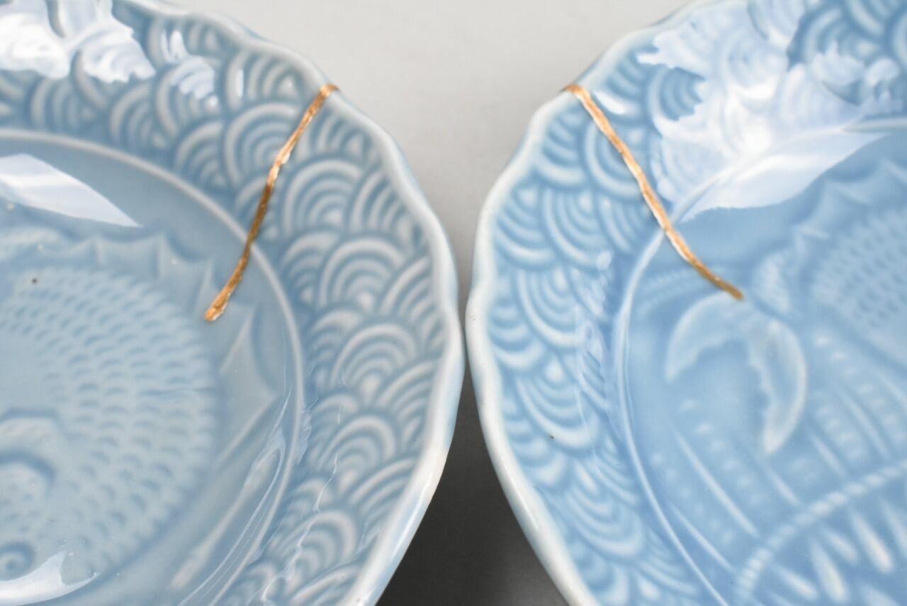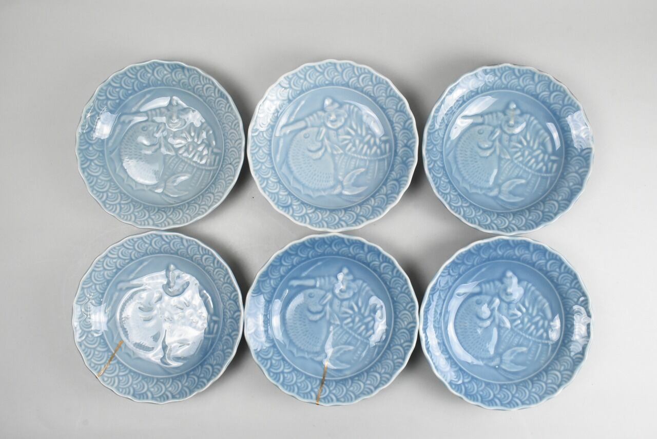 雑談が過ぎましたが、このお皿には見込みに恵比寿様、輪花型の口縁周りには青海波を描いていて、まさに海を連想させる漁業の神様のお皿です。ブルーの色味も相まってます。