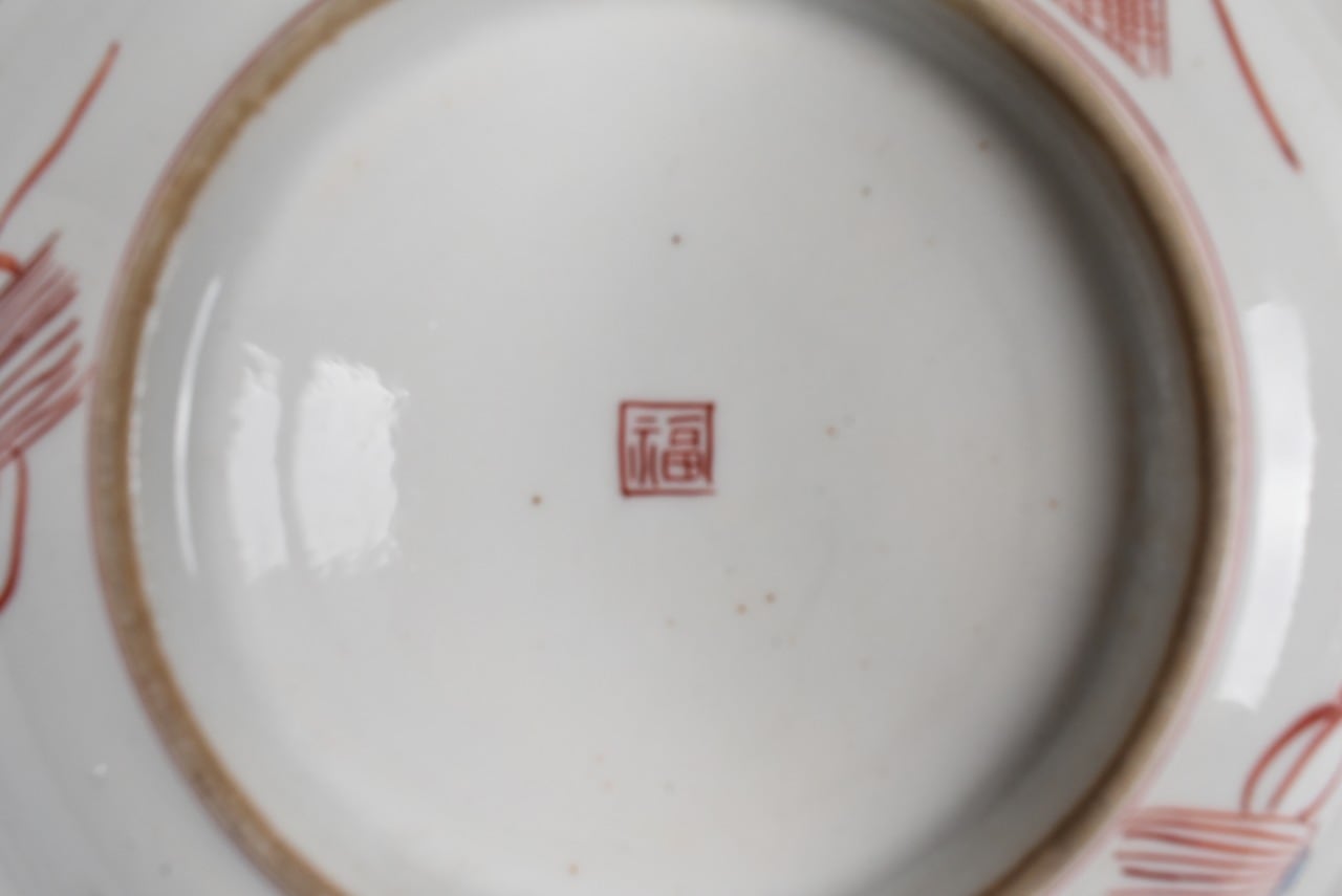 口縁は輪花型、見込みに向かって陽刻の模様、見込み部分には人物が描かれています。