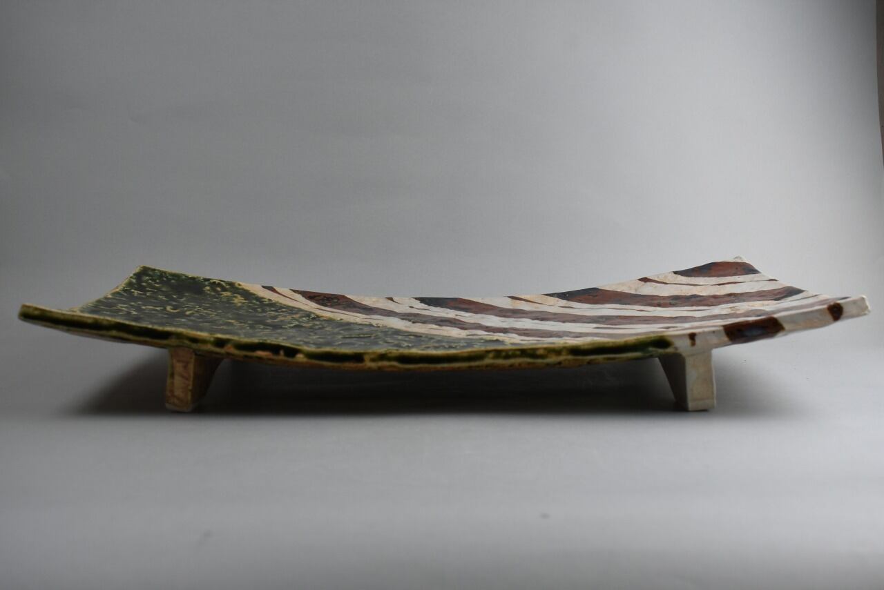 鉄絵で縞模様の絵付けを施した後、織部釉と透明釉を掛け分けた作品。シンプルな構図ながらサイズが大きいので迫力が増して感じます。厚みもあるからだと思います。