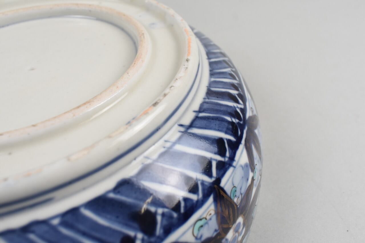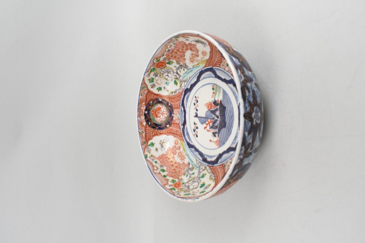 外側(胴回り)は藍、見込み部分は赤を基調としたメリハリのある色合いが特徴です。