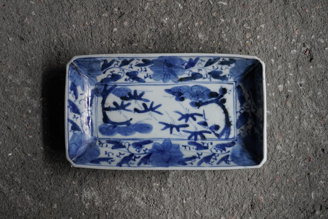 花唐草松竹梅長方皿 np008001 size W19.5cm D11.3cm H3cm 染付ならではの味わい深さと上品さを感じる一枚。 食卓に静かなぬくもりを与えてくれます。 お寿司をのせても楽しめそうです。 状態 ふりもんがある箇所がございます。 骨董品のため小傷がございます。ご了承下さい。 その他、詳細は画像をご確認の上、 懸念点はお気軽にお問い合わせ下さい。 ----- 当店は骨董を扱う中古食器ショップのため、 製造時/経年による傷や風合いの変化がございます。 際立つダメージは記載しておりますが、 古物へのご理解をお願い致します。 店舗にて現物のご確認も可能です。 また色や質感は お使いのモニターやブラウザによって、 実際とは異なって見える場合がございます。 *オンライン掲載の全ての商品は業務販売可能です。 *飲食店、小売業者様へはご購入金額に応じた割引がございます。詳細はお問合せください。